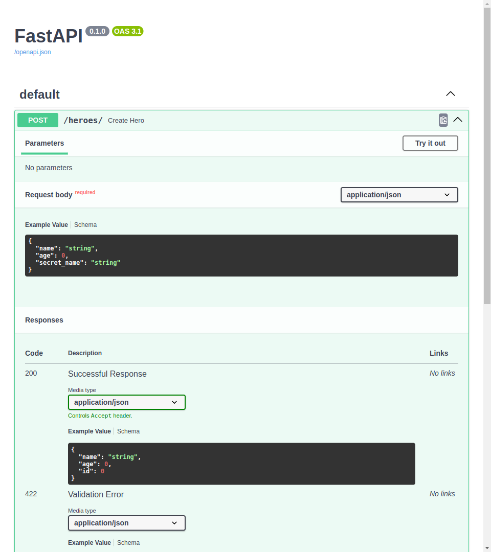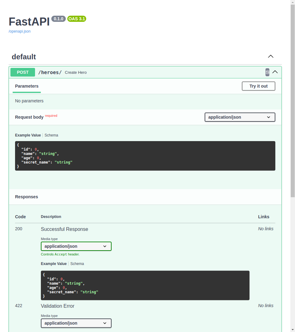 If you go to the /docs API UI, you will see that it is now updated, and it won't expect to receive the id from the client when creating a hero, etc.